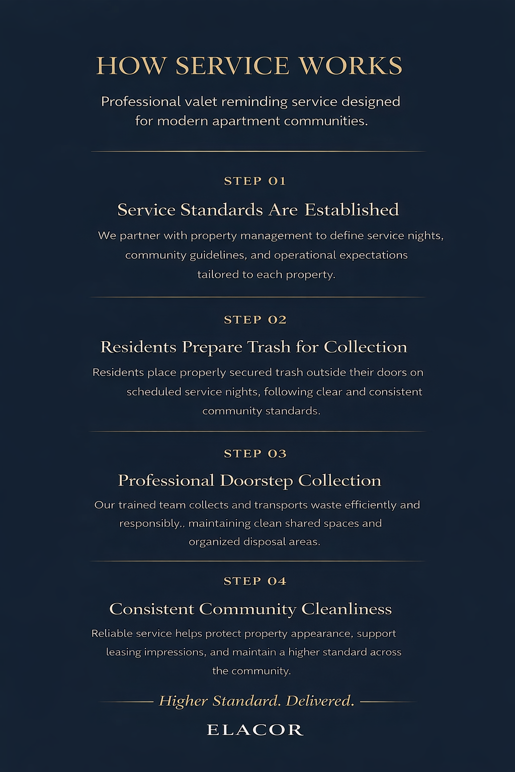 Elacor partners with apartment communities to provide reliable doorstep trash collection that improves cleanliness, reduces maintenance workload, and enhances the resident living experience. Our valet trash service allows residents to place bagged trash outside their door on scheduled service nights. Our team collects the waste and transports it to the community dumpster or compactor area.